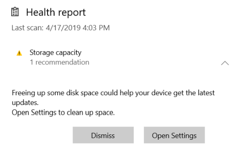 В качестве примера, отчет, сгенерированный Windows 10 на нашем тестовом ноутбуке, говорит о том, что у нас есть проблема с емкостью хранилища. Нажмите на предупреждение, чтобы получить более подробную информацию. В нашем случае Windows 10 рекомендовала открыть «Настройки» и очистить место для хранения, чтобы у нас было больше места для приложений, файлов и обновлений.