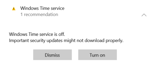 Затем он сказал, что у нас проблема с сервисом Windows Time. Мы щелкнули по нему, и Windows 10 сказала нам, что служба отключена, а это означает, что она не работает. Мы нажали «Включить», и Windows 10 правильно настроила службу.