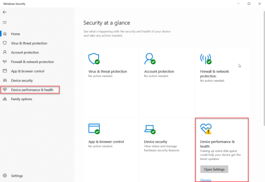 Система безопасности Windows теперь открыта и отображает раздел «Производительность и работоспособность устройства».