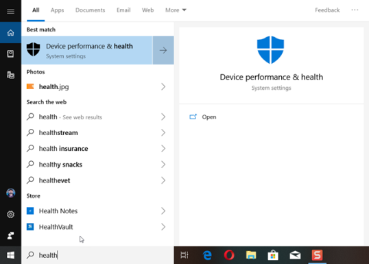 Другой способ добраться до того же места — использовать поиск в Windows 10. Например, найдите слово «здоровье», а затем щелкните или нажмите на результат, который говорит: «Производительность и работоспособность устройства».