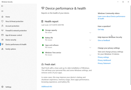 В разделе «Производительность и работоспособность устройства» системы безопасности Windows см. отчет о работоспособности. Вы можете увидеть дату и время последнего сканирования, выполненного в Windows 10. Операционная система проверяет следующие области на наличие проблем и предоставляет общий статус для каждой из них: