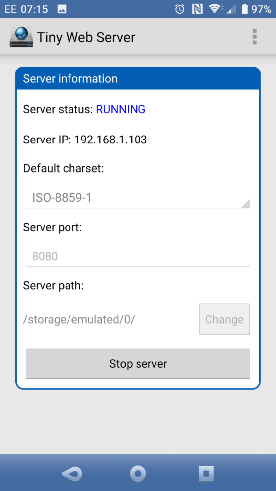 После установки Tiny Web Server запустите приложение. На главном экране у вас есть опция Изменить путь к серверу, что полезно, если вы хотите указать каталог для хранения ваших веб-файлов.