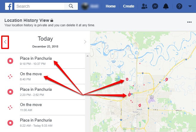 Вы можете просмотреть предыдущие дни и историю местоположений, просто нажав на стрелку влево. Таким образом, вы можете увидеть, как просто просматривать историю местоположений на Facebook.