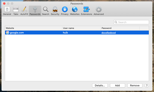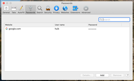 Теперь вы находитесь в разделе. В разделе «Пароли» вы можете увидеть список всех сайтов, для которых Safari сохранил пароли. Вероятно, это будет гораздо более длинный список, чем тот, который показан ниже. Каждая запись содержит веб-сайт, имя пользователя и пароль, которые были скрыты в виде последовательности точек в целях безопасности.