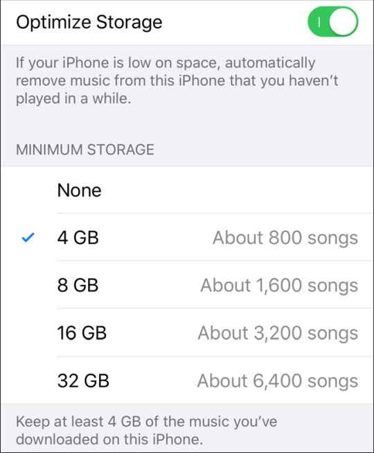 В разделе «Минимальное хранилище» выберите, сколько музыки вы хотите хранить на своем iPhone или iPad постоянно. Если вы выберете «Нет», Apple удалит всю музыку, если вам не хватает места, и она нужна другим функциям (например, если вы записываете видео 4K). Кроме этого, вы можете выбрать вариант 4, 8, 16 или 32 ГБ.