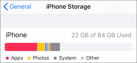 В верхней части экрана вы увидите используемое пространство на вашем iPhone или iPad. Чтобы узнать доступное пространство, вычтите использованное пространство из общей емкости хранилища. Для скриншота ниже это будет 64 ГБ минус 22 ГБ, что составляет 42 ГБ свободного места на диске.