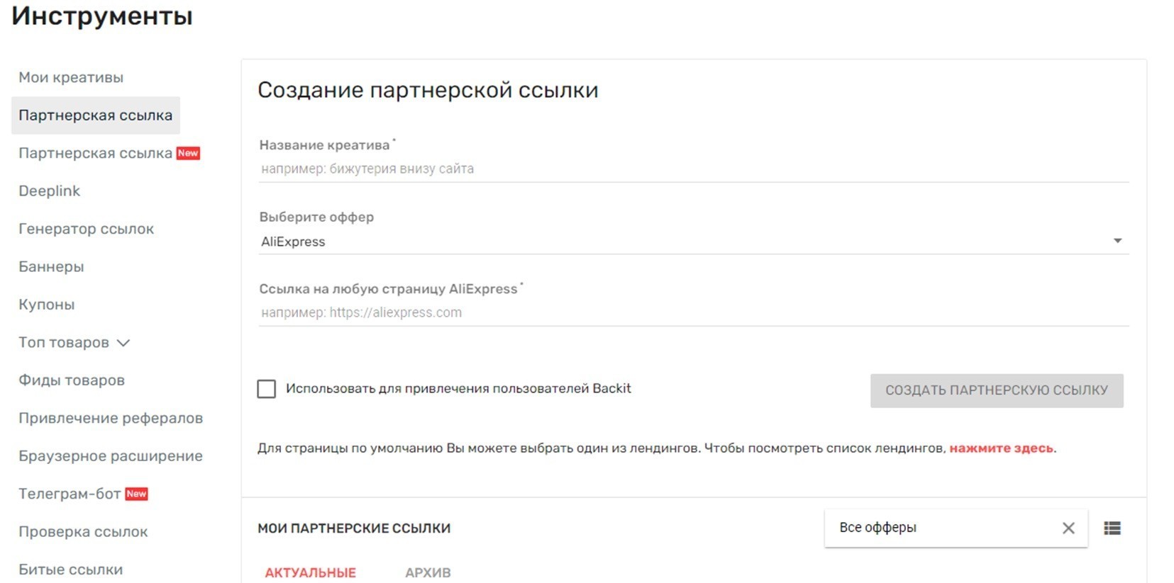 После входа через социальную сеть или после окончания регистрации, пользователю сразу же доступно огромное количество инструментов сайта: создание ссылок на категории товаров или на конкретный товар, а также создание баннеров дают разнообразие к рекламированию продукции с AliExpress и других торговых площадок – крупных и не очень.