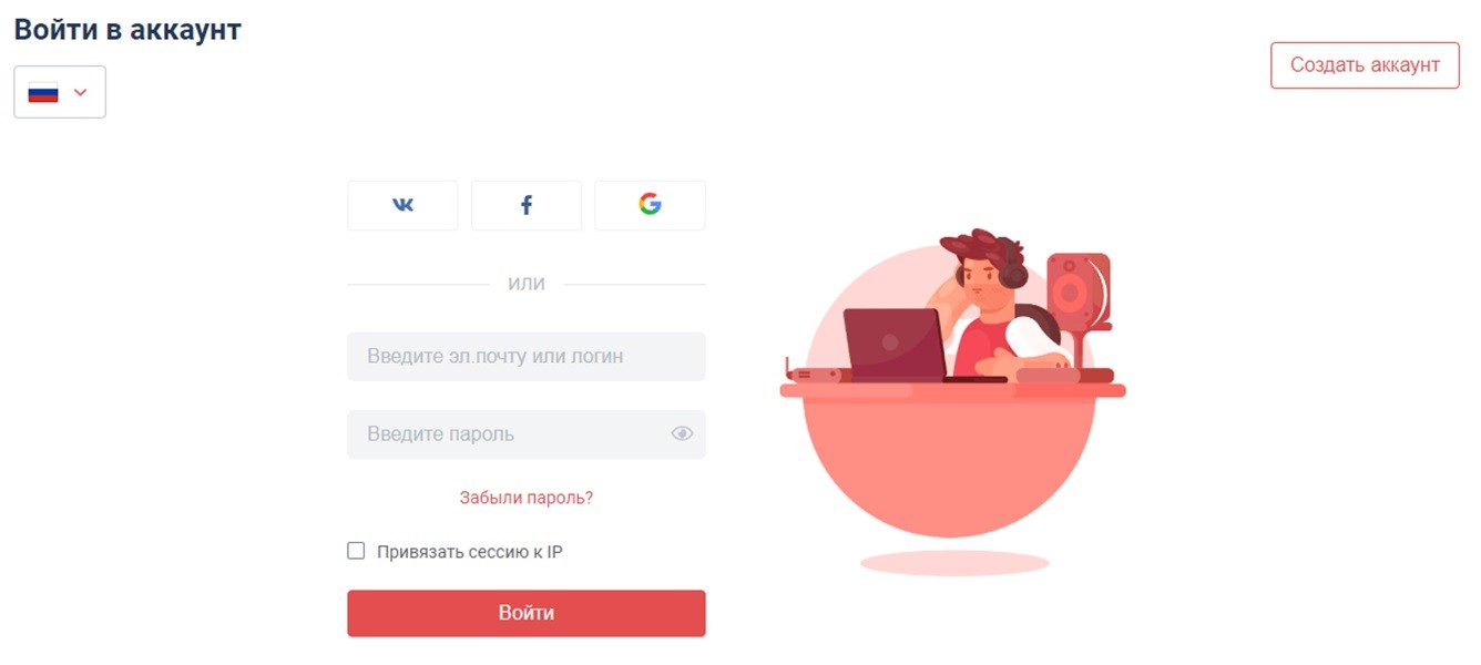 Здесь все обстоит намного проще: регистрация проходит всего в пару кликов и не требуется заполнение огромного количества контактных данных и информации насчет рекламирования товаров. Достаточно провести обычную регистрацию(ввести адрес электронной почты и желаемый пароль), но есть также более удобный способ синхронизации аккаунта с другим – привязка к ВКонтакте, Facebook и Google доступна каждому новому регистрирующемуся пользователю.