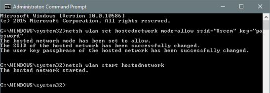 netsh wlan set hostednetwork mode=allow ssid="WiFi_network_name" key="password" netsh wlan start hostednetwork
