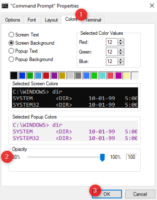 В окне «Свойства командной строки» перейдите на вкладку «Цвета». Найдите ползунок «Непрозрачность» и переместите его на нужное значение. Нажмите или коснитесь OK, чтобы сохранить изменения.