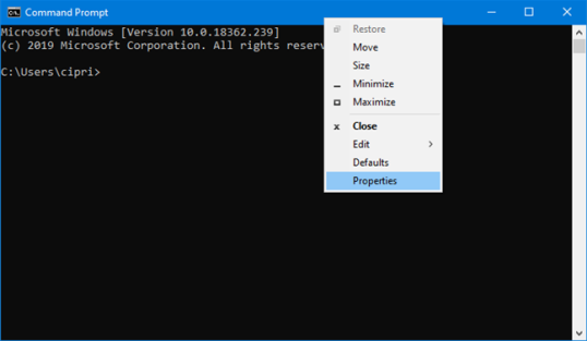 Запустите командную строку (cmd) и щелкните правой кнопкой мыши или нажмите и удерживайте в строке заголовка. В открывшемся меню перейдите в Свойства.