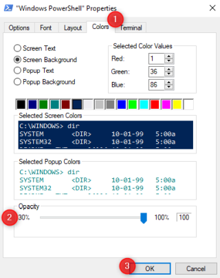 С этого момента каждый раз, когда вы открываете PowerShell , он использует заданный вами уровень непрозрачности. Чтобы снова сделать его непрозрачным, повторите ту же процедуру еще раз и установите ползунок «Непрозрачность» на 100%.