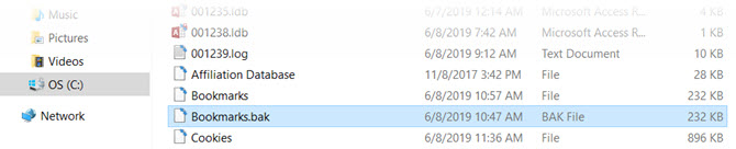 Если ваш файл закладок по какой-либо причине исчез или поврежден, вы можете восстановить все сохраненные закладки из этого файла резервной копии. Просто переименуйте файл резервной копии, удалив расширение «.bak».