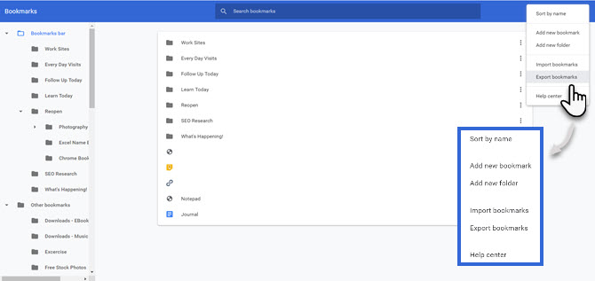 Вы также можете организовать свои закладки перед экспортом, выбрав «Сортировать по имени» в меню выше в Диспетчере закладок.