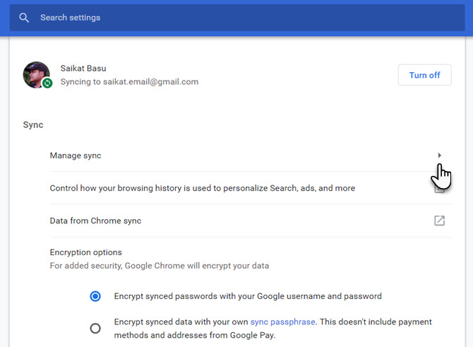 Шаг 4: На следующем экране нажмите стрелку для управления синхронизацией. Вы также можете изучить параметры шифрования для дополнительной безопасности.