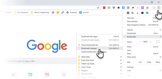 Шаг 2. Нажмите кнопку Chrome Customize and Control (три точки в правом верхнем углу). Выберите Закладки → Диспетчер закладок в меню. Или щелкните правой кнопкой мыши в любом месте панели закладок, если она видна.