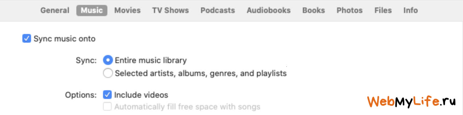 4. Теперь нужно выбрать, хотите ли вы синхронизировать всю свою музыкальную библиотеку или только выбранные альбомы, плейлисты, исполнители или жанры. Если вы решите синхронизировать всю свою библиотеку, все готово. Нажмите «Применить», затем «Синхронизация» и подождите, пока все не закончится. Если вы выбрали выборочную синхронизацию музыки, переходим к следующему шагу.