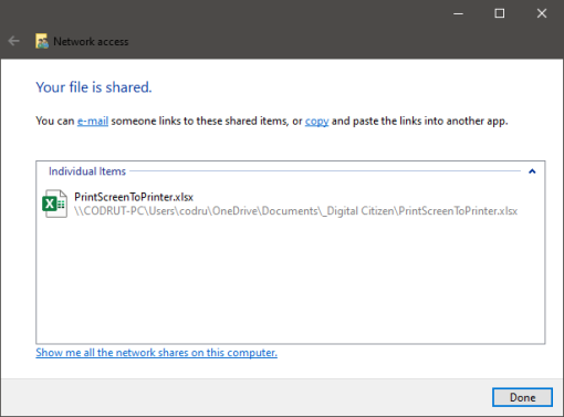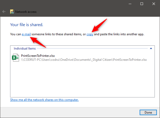 Посмотрите внимательно под «Файл/папка/библиотека совместно» уведомления. Там Windows сообщает, что «Вы можете отправить кому-нибудь ссылки на эти общие элементы по электронной почте или скопировать и вставить ссылки в другое приложение».