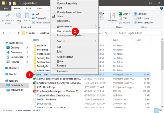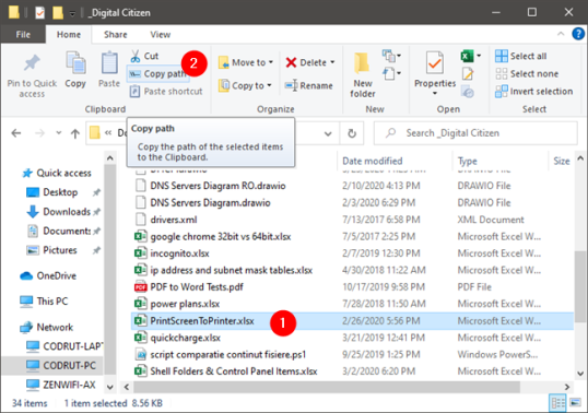 Если вы используете Windows 10, вы можете также выбрать пункт (файл, папка, библиотека) и нажмите кнопку или нажмите на «Копировать в пути» кнопке из File Explorer, домашней вкладки.