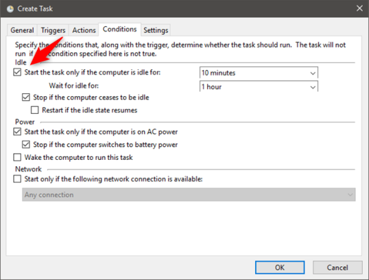 Если вы хотите, чтобы задача не мешала вашей работе, вы можете настроить ее на запуск только тогда, когда компьютер находится в режиме ожидания. Установите флажок «Запустить задачу только в том случае, если компьютер простаивает» и выберите один из доступных периодов. С того момента, как вы запустили задачу, вы можете подождать, пока компьютер перейдет в состояние ожидания на определенный период или вы можете выбрать «Не дожидаться простоя». Когда компьютер больше не находится в состоянии ожидания, вы можете остановить работу или перезапустить его, если возобновление состояния ожидания. В качестве возможного сценария использования эти параметры простоя полезны, когда вы знаете, что для выполнения вашей задачи может потребоваться много системных ресурсов для запуска. Установка их на запуск, когда ваш компьютер или устройство находится в режиме ожидания, означает, что вы не будете беспокоиться о том, что программы работают медленно из-за этой задачи, которая поглощает большинство ресурсов вашего компьютера.