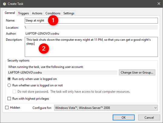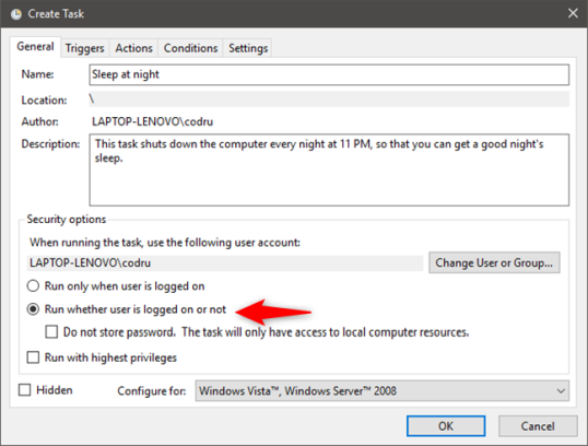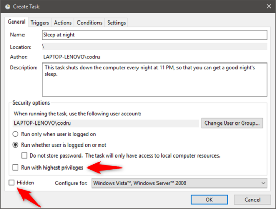 Если для вашей задачи требуются права администратора, не забудьте установить флажок «Запустить с наивысшими привилегиями». Затем проверьте параметр «Скрытый», если вы не хотите, чтобы задача была видимой. Это означает, что вошедший в систему пользователь не уведомляется о запуске или завершении задачи. Мы не собираемся это делать, потому что мы хотим, чтобы пользователь смог остановить процедуру выключения, если он или она хочет использовать ПК в ночное время. 🙂