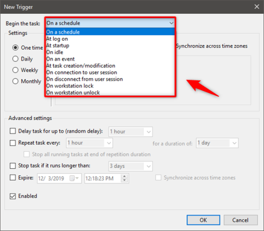Первая настройка триггера — это выбор, когда начинать задачу. Нажмите или коснитесь раскрывающегося списка «Начать задачу» и выберите один из доступных вариантов.