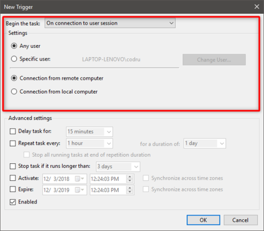 Есть несколько дополнительных триггеров по сравнению с мастером Создания базовых задач, например: «При создании/изменении задачи», «При подключении к пользовательскому сеансу», «При отключении от пользовательского сеанса», «При блокировке рабочей станции» и «При подключении к пользовательскому сеансу», «При разблокировке рабочей станции». На основе выбранного вами варианта вам необходимо задать разные настройки на панели «Настройки», но доступные дополнительные параметры остаются теми же, независимо от того, какой триггер вы выберете.