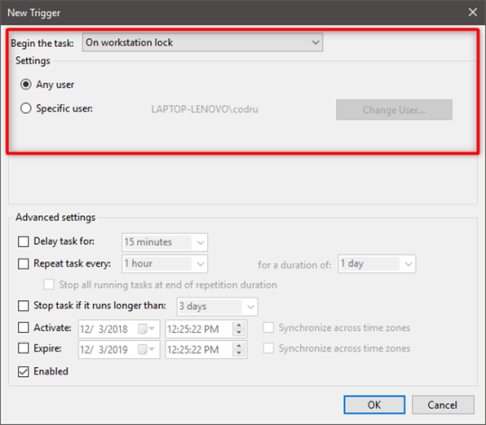 Для триггеров «On workstation lock» и «On workstation unlock» вам нужно только установить, относится ли это к любому пользователю или конкретному пользователю. По умолчанию конкретный пользователь является текущим. Вы можете щелкнуть или нажать «Изменить пользователя», чтобы выбрать другую учетную запись пользователя.