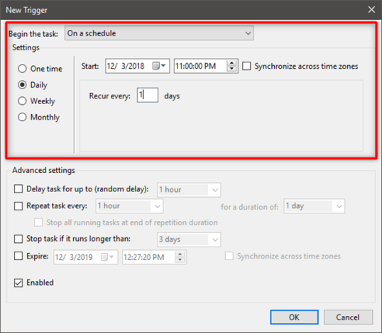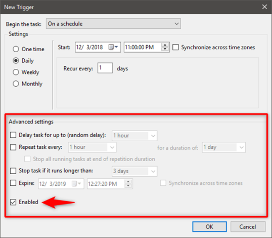 Для ежедневной задачи остановки ПК, которую мы создаем, нам не нужны какие-либо из этих дополнительных настроек: все, что нам нужно сделать, это убедиться, что задача включена.