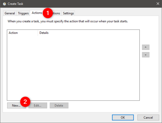 Вы можете назначить несколько действий для задачи. Для этого перейдите на вкладку «Действия» и нажмите кнопку «Создать» или нажмите кнопку «Создать».