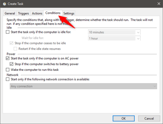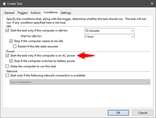 Поскольку задача может выполняться в течение длительного времени, планировщик заданий позволяет вам выполнить задачу таким образом, чтобы она запускалась только тогда, когда компьютер находился в сети переменного тока, и чтобы остановить задачу, если вы переключитесь на питание от батареи. Если ваш компьютер находится в спящем режиме, и настало время запустить задачу, вы можете настроить компьютер на пробуждение и запустить задачу.