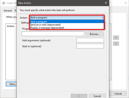 Выберите одно из действий, которое должна выполнить задача, щелкнув или нажав раскрывающийся список Действие. Вы можете выбрать: запуск программы, отправка электронной почты или отображение сообщения.