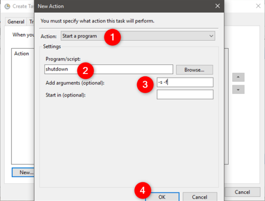 Для нашей задачи выключения мы должны выбрать «Запустить программу». Затем мы должны ввести команду shutdown в поле Program/script. Чтобы эта команда работала, мы также должны вводить правильные аргументы, поэтому в разделе «Добавить аргументы» мы будем вводить -s и -f. Аргумент -s указывает компьютеру, что мы хотим, чтобы он закрылся, а не перезагрузился или заснул, а аргумент -f сообщает, что мы хотим заставить приложения закрыться при завершении работы.