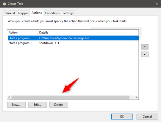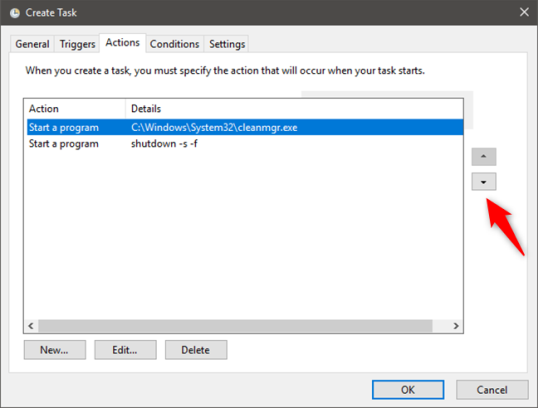 Как мы уже упоминали ранее, вы можете создать несколько действий для задачи. Например, вы можете создать задачу, которая запускает очистку диска, и только затем выключает компьютер. Вы можете изменить порядок действий, нажав или нажав кнопки, найденные в правой части списка действий.