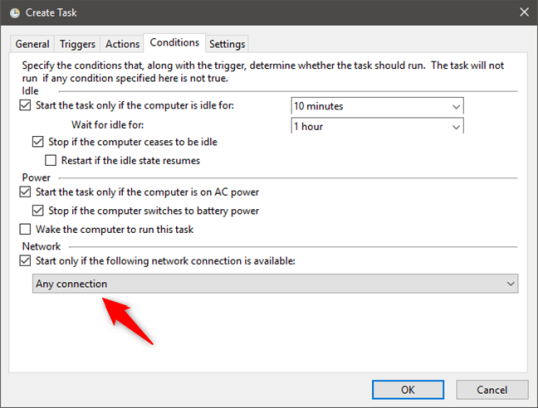 Если вам известно, что для выполнения задачи требуется определенное сетевое соединение, установите флажок «Начать, только если доступно следующее сетевое подключение», и выберите интересующее вас соединение.