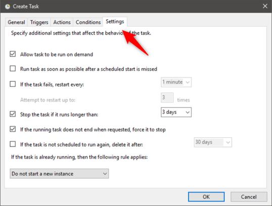 Планировщик заданий позволяет вам делать настройки, которые будут полезны в особых сценариях, таких как сбой задачи или когда выполняемая задача не заканчивается по запросу. Перейдите на вкладку «Настройки» мастера создания задачи.