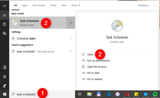Начните с открытия Планировщика заданий. Быстрый способ открыть планировщик заданий в любой версии Windows — использовать поиск: поиск «планировщик задач» и щелчок или поиск соответствующего результата поиска.