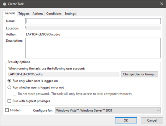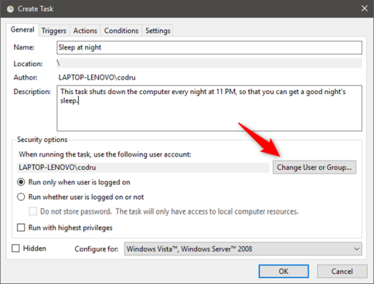 На вкладке «Общие» также можно настроить дополнительные «параметры безопасности», относящиеся к учетной записи пользователя и привилегии, используемые для запуска создаваемой задачи. По умолчанию учетная запись пользователя, используемая для запуска задачи, является той, которую вы используете для создания задачи. Если вы хотите использовать другую учетную запись пользователя при выполнении задачи, нажмите или коснитесь кнопки «Изменить пользователя или группу» и выберите другую.