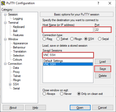 - Вы также захотите сохранить этот сеанс, поэтому в текстовом поле «Сохраненные сеансы» добавьте подходящее имя для вашего SSH-соединения и нажмите кнопку «Сохранить».