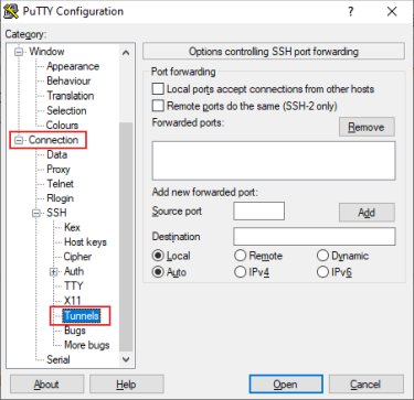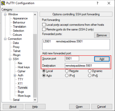 - В разделе «Переадресация портов» меню «Туннели» вы предоставите сведения, которые позволят PuTTY туннелировать ваше соединение VNC через SSH. В текстовом поле «Порт источника» введите 5901. В текстовом поле «Адресат» введите свой удаленный IP-адрес: 5901, используя IP-адрес удаленного настольного ПК или сервера. Например, 192.168.1.100:5901 подойдет.