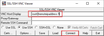 - Откройте клиент SSVNC и в главном окне клиента SSVNC заполните необходимые поля. В разделе VNC Host: Display введите SSHusername@remoteIPaddress:1. Замените SSHusername на имя пользователя, которое вы будете использовать для вашего SSH-соединения, и замените адрес удаленного IP-адреса на IP-адрес удаленного рабочего стола. Например, root@192.168.1.100:1.