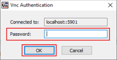 - Вам будет предложено ввести пароль вашего сервера VNC, поэтому укажите его во всплывающем окне «Аутентификация VNC» и нажмите кнопку «ОК».