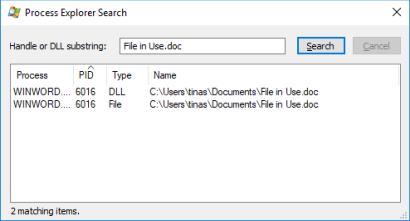 Process Explorer — это более мощный File Explorer. Он не только перечисляет все запущенные процессы, он также может показать вам, какой процесс взял ваш файл в заложники. Просто откройте Process Explorer Search через Find → Find Handle или DLL (или нажмите Ctrl + F ), введите имя файла и дождитесь списка процессов, обращающихся к вашему файлу.
