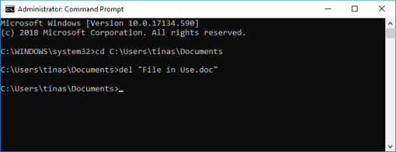 Введите эту команду, чтобы удалить файл, заменив все в кавычках фактическим именем файла: del "File in Use.doc"