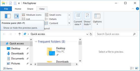 Нажмите Windows + E , переключитесь на вкладку «Вид» и нажмите Alt + P, чтобы закрыть панель предварительного просмотра. Снимок экрана ниже показывает открытую панель предварительного просмотра справа.