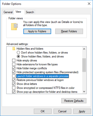 В окне «Параметры папки» перейдите на вкладку «Вид» и найдите окна «Запуск папки» в отдельном параметре процесса. Убедитесь, что это не проверено. Нажмите Применить, чтобы сохранить любые изменения.