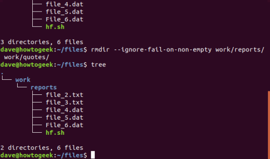 В следующем примере две папки были переданы в rmdir , это work/reports и work/quotes. Параметр --ignore-fail-on-non-empty включен в команду. В папке work/reports находятся файлы, поэтому rmdir не может удалить ее. Опция --ignore-fail-on-non-empty заставляет rmdir игнорировать ошибку и переходить к следующей папке, которую он должен обработать, это work/quotes. Это пустая папка, и rmdir удаляет ее.