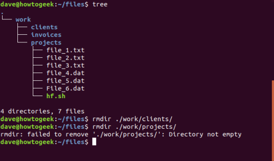 Если вы попытаетесь удалить не пустую папку, rmdir выдаст вам сообщение об ошибке. В следующем примере rmdir успешно и без вывода сообщений удаляет каталог clients но отказывается удалять каталог projects поскольку он содержит файлы. Каталог projects остается точно таким, каким он был, а файлы в нем нетронутыми.