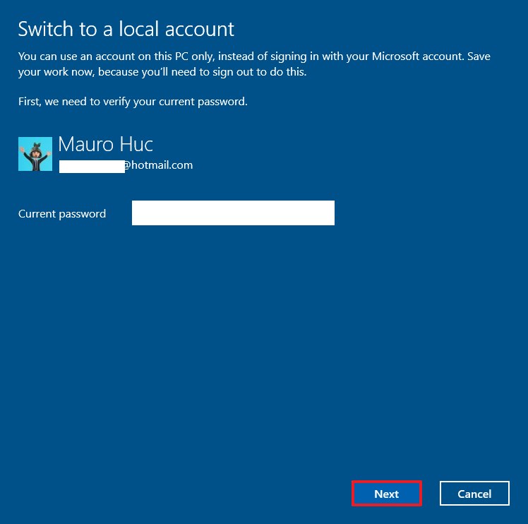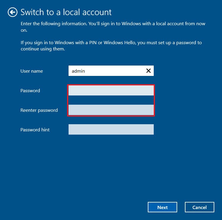Чтобы переключиться на локальную учетную запись и удалить пароль, выполните следующие действия: