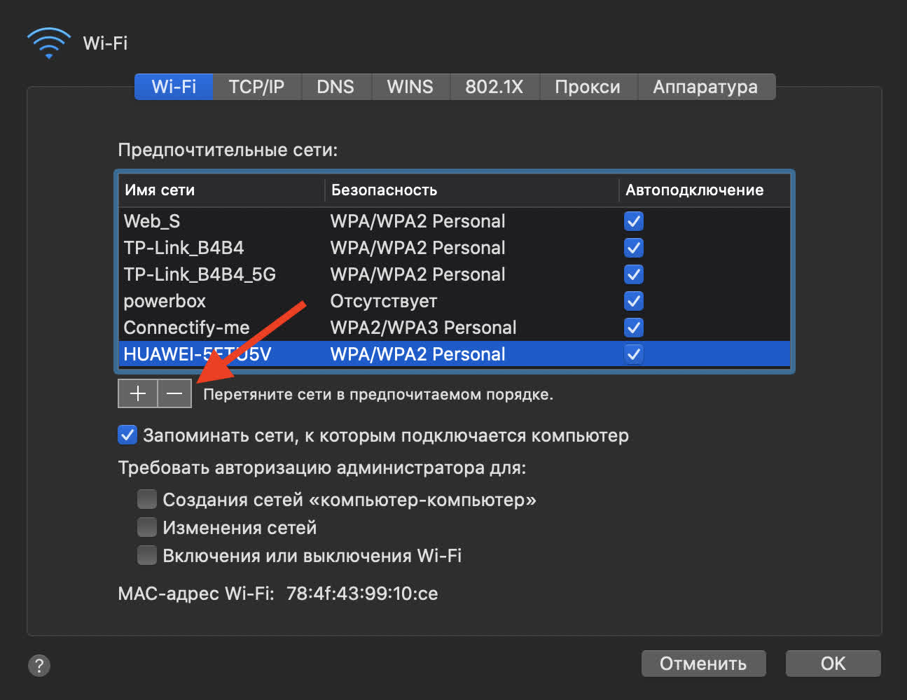 На вкладке «Wi-Fi» прокрутите страницу и выберите сеть, которую вы хотите, чтобы ваш Mac забыл, а затем нажмите знак минус (-).